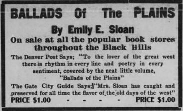 Mrs. Sloan is well known in the eastern part of the state and in North Dakota [sic — South Dakota] as the poetess of the plains, being best known because of her ‘Ballads of the Plains,’ published first in 1908. She is at present writing new poems and expects to publish another volume soon.