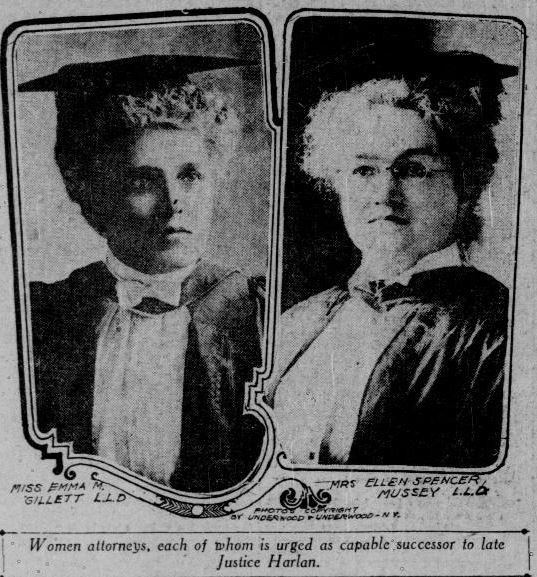 gillettmussey“A woman lawyer may succeed the late Chief Justice Harlan on the United States supreme court bench. The names of Miss Emma M. Gillett, LL.D., and Mrs. Ellen Spencer Mussey, LL.D., have been suggested to President Taft by the District of Columbia Women Suffrage association. The president has been requested by the association to choose one of the women in making an appointment to fill the vacancy.